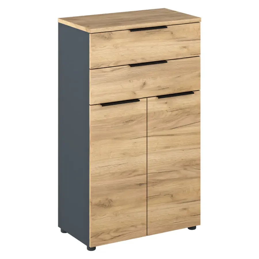 Skříňka KLAUDIUS Typ 3 je praktický kus nábytku určený pro organizaci dokumentů a drobného kancelářského příslušenství. Disponuje dvou dveřmi a dvěma šuplíky, které tvoří přehledný úložný prostor pro vaše věci. Vyrobená je z DTD laminované v kombinaci barev grafit a dub artisan, což působí moderně a profesionálně. Rozměry činí 70 × 40 × 120 cm (Š × H × V) a tloušťka materiálu se pohybuje v rozmezí 1,6–2,2 cm. Výška šuplíků je 19 cm a nosnost každé zásuvky i police je 5 kg, takže pojme většinu kancelářských doplňků. Nohy dosahují výšky 2,8–4,3 cm, což usnadňuje vyrovnání na nerovném podkladu. Dodáváno v demontu. Zvolte řadu KLAUDIUS pro efektivní a příjemné pracovní prostředí, které kombinuje praktičnost s moderním vzhledem.