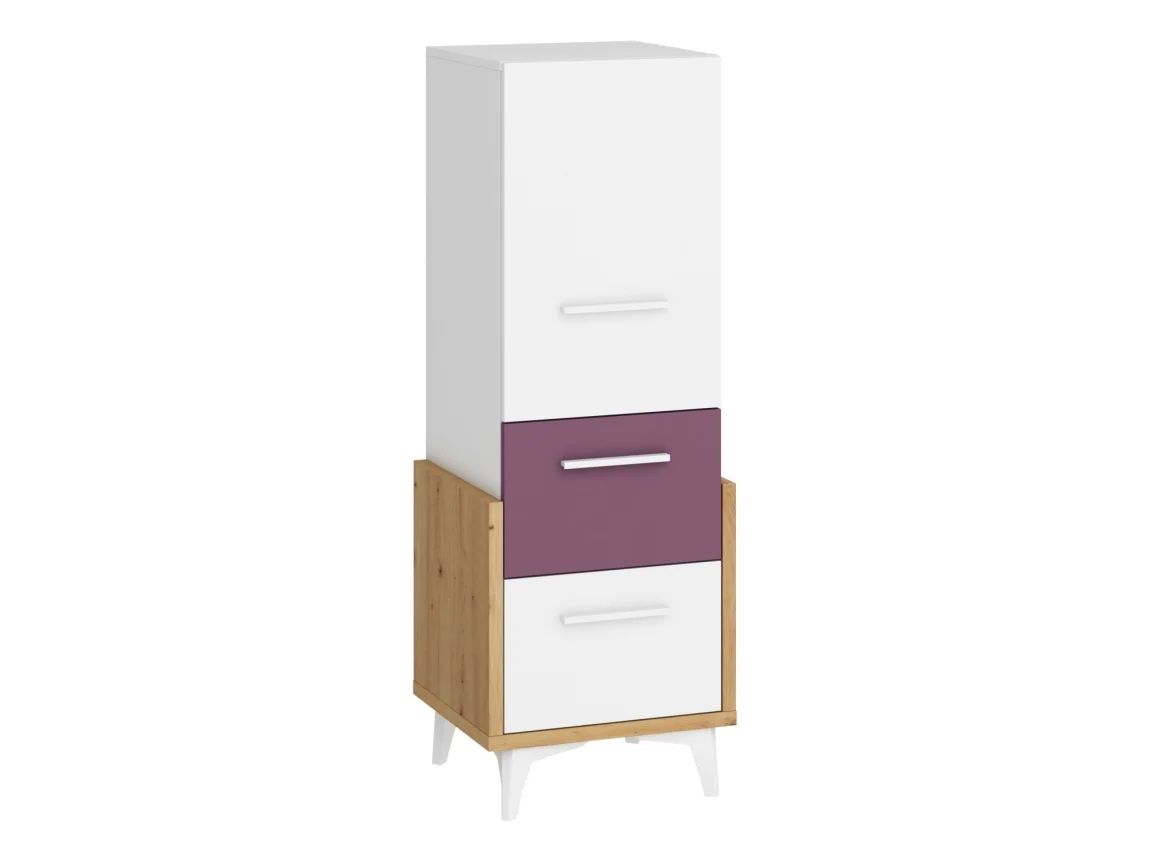 Skříňka LEPON 45N nabízí praktický úložný prostor se dvěma zásuvkami a vnitřní poličkou. Dekor kombinuje dub artisan s bílou a fialovou, nožky a úchytky jsou bílé. Rozměry: 45 cm šířka, 127 cm výška a 42 cm hloubka; výška nožek činí 12 cm.