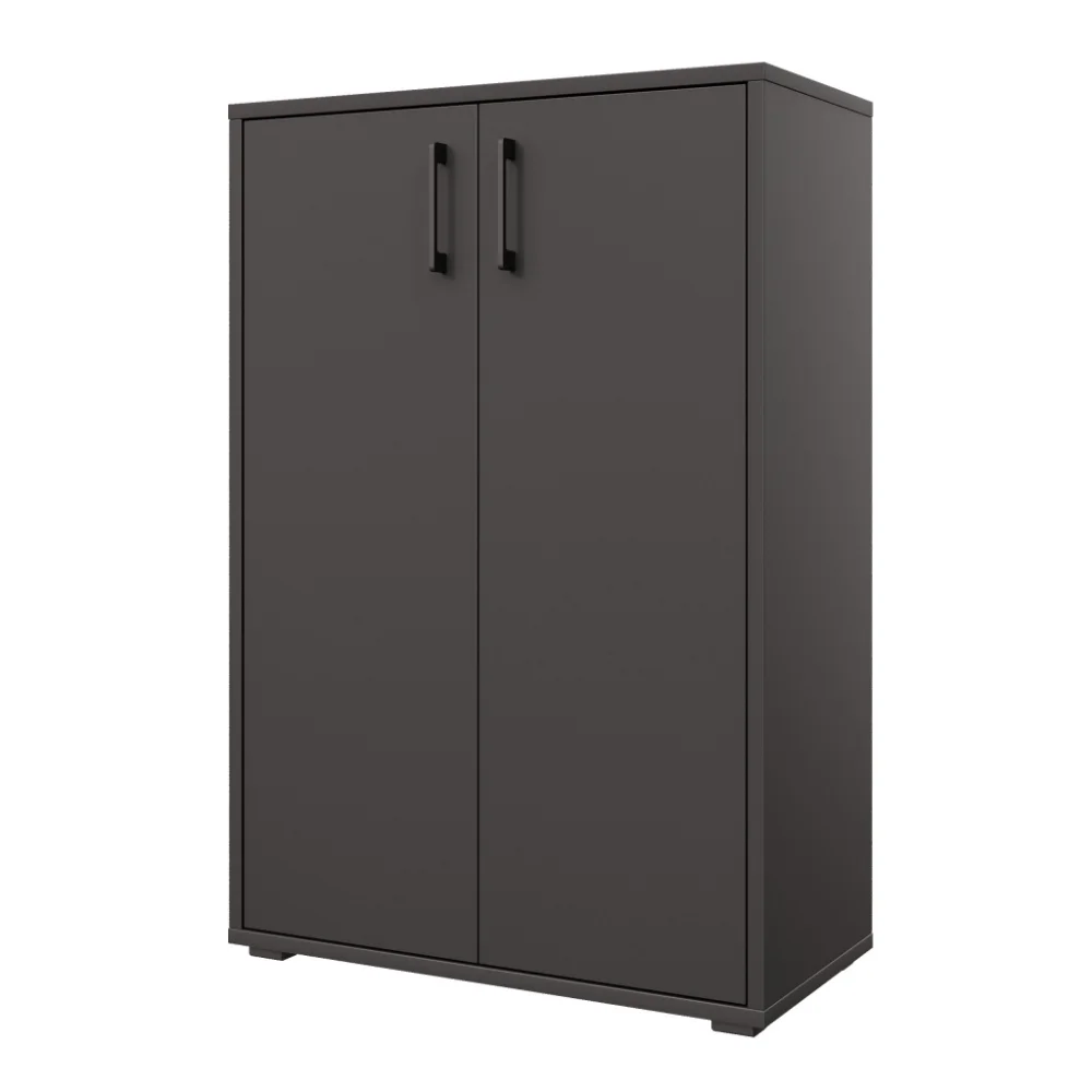 Skříňka s 2 policemi v jednotném antracitovém provedení pro korpus i dvířka. Zhotovena z laminovaného materiálu tloušťky 22 mm (korpus) a 16 mm (dvířka) s ABS hranou 2 mm. Rozměry: šířka 80 cm, výška 118,7 cm a hloubka 41,6 cm.