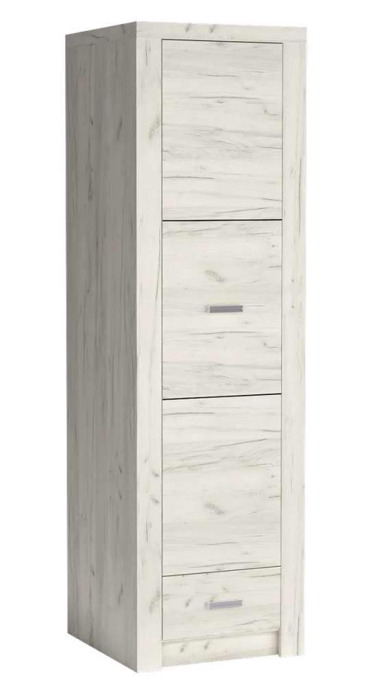 Skříňka má jedny dveře a jedna zásuvka; uvnitř se nachází prostor s šatní tyčí pro zavěšení oděvů. Materiál tvoří kvalitní laminovaná deska s ABS hranami o tloušťce 0,5–0,8 mm, úchyty jsou kovové. Barevné provedení: jasan bílý. Rozměry: šířka 56 cm, hloubka 58 cm, výška 192 cm. Dodáváme v demontovaném stavu, což usnadňuje přepravu i montáž. Díky světlému odstínu jasan bílý skříňka působí vzdušně a praktické vnitřní řešení usnadní organizaci oděvů i doplňků.