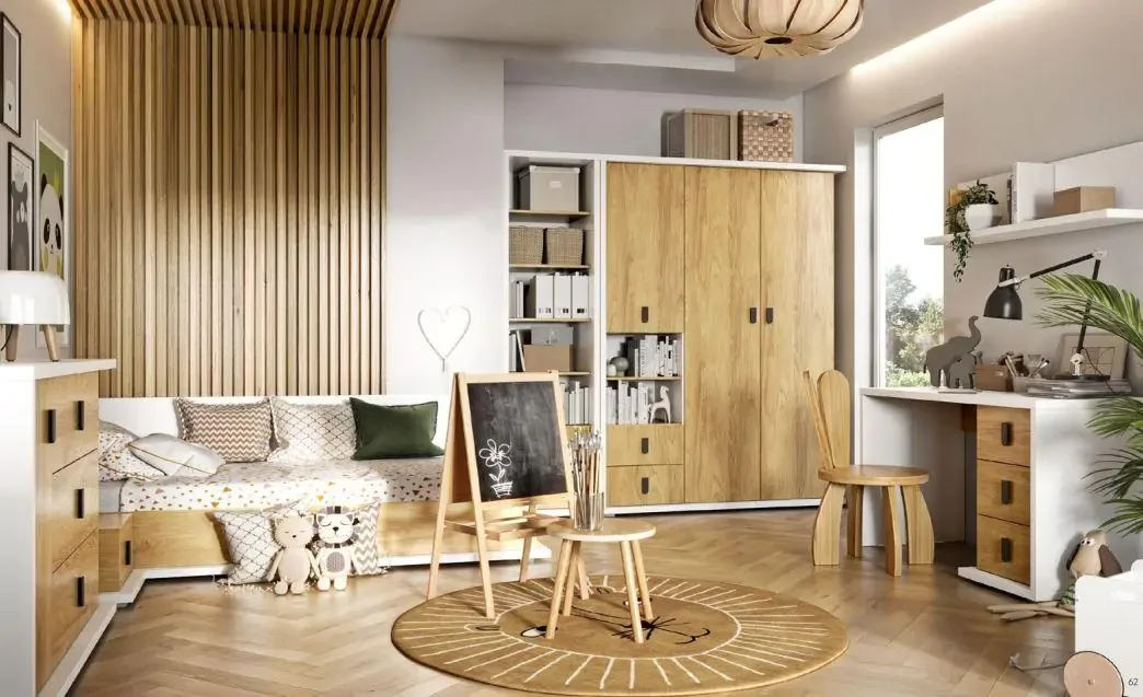 SOMAS SET1 představuje praktickou sestavu dětského pokoje v jemném přírodním stylu, která kombinuje světlý korpus s teplým odstínem dřevěného dekoru. Korpus tvoří LTD deska v bílé barvě, dvířka, zásuvky a police jsou z LTD v barvě ořech natural. Sestavu tvoří tyto prvky (rozměry v cm): skříň třídveřová 150 × 200 × 55, regál se zásuvkami 55 × 200 × 55, pracovní stůl 126 × 75 × 55, závěsná police 120 × 30 × 22, levý noční stolek 43 × 70 × 45 a postel s úložným prostorem v levém provedení 102 × 70 × 212; součástí postele je i bonelová matrace. Dodáváme v demontovaném stavu. Díky svému funkčnímu provedení a dostatečné úložné kapacitě je ideálním řešením pro pokojíček, který bude růst s vaším dítětem a umožní snadnou organizaci věcí.