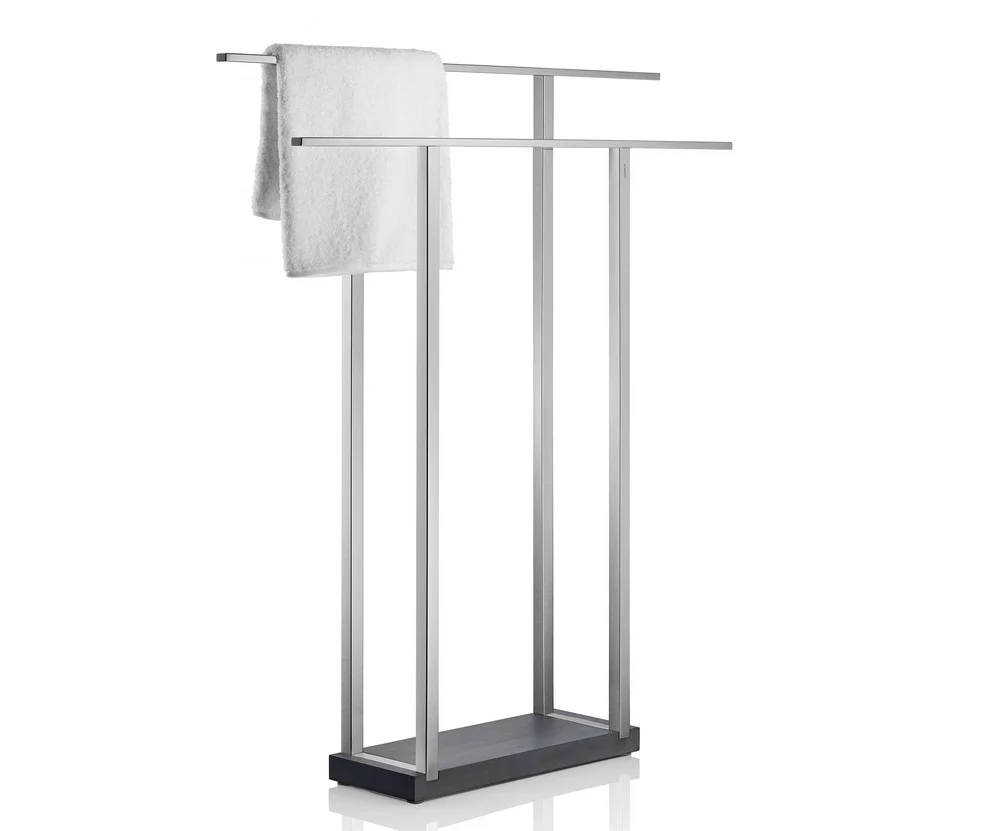 Stojan na ručníky MENOTO o výšce 90 cm a šířce 75 cm spojuje matnou nerezovou ocel s polystone, čímž vzniká nadčasový a elegantní vzhled do každé koupelny. Disponuje dvěma tyčemi pro pohodlné pověšení ručníků a zároveň nabízí místo pro odložení drobného oblečení. Díky pevné konstrukci a čistému designu budou ručníky suché a nepřipůsobí se na podlaze, což zvyšuje bezpečí i pořádek v koupelně. Kolekce MENOTO představuje soubor doplňků do koupelny se sjednocujícím stylem a snadnou údržbou. Pro ještě kompletnější vzhled doporučujeme doplnit další produkty z řady MENOTO, které spolu vytvářejí harmonický interiér.