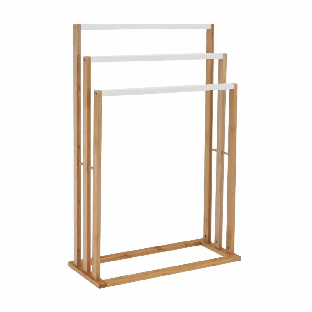 Stojan na ručníky NEMOKOW v přírodním provedení s bílými detaily je praktickým a stylovým doplňkem každé koupelny i ložnice. Trojřadý systém s třemi pevnými lištami poskytuje dostatek místa pro ručníky a osušky a jeho lehká konstrukce usnadňuje přesouvání podle potřeby.