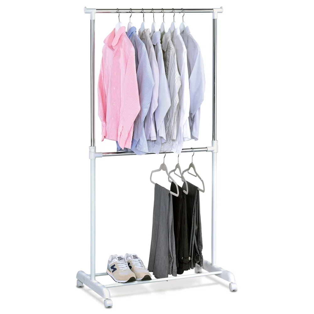 Stojan na šaty s kolečky nabízí snadné přesouvání po místnosti a výškové nastavení až do 170 cm. V dolní části najdete praktický odkladač na boty, který pomáhá udržet obuv na jednom místě.