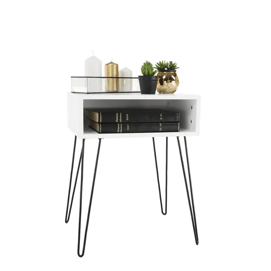 Příruční stolek HONEJ je praktický doplněk do ložnice, obýváku i předsíně. Jeho provedení kombinuje matně bílou lakovanou MDF desku s pevným černým kovovým rámem, který zajišťuje stabilitu. Ve spodní části najdete otevřený úložný prostor, který usnadní rychlý dosah k drobnostem, jako jsou knížky, ovladače či budík. Dodává se v demontu, ale složení zvládnete snadno podle návodu. Tento příruční stolek HONEJ díky kompaktním rozměrům 45 x 35 x 58 cm nabídne praktickou plochu a zároveň zbytečně nepřetíží interiér, takže skvěle poslouží např. u postele, sedačky či v chodbě.