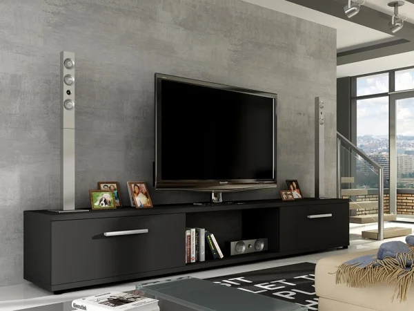 Stolek pro televizi LOBA RTV v elegantním provedení s černým mat povrchem dodá vašemu obýváku moderní a nadčasový vzhled. Rozměry 176 × 40 × 28 cm poskytují dostatek prostoru, aniž by stolek působil objemně.
