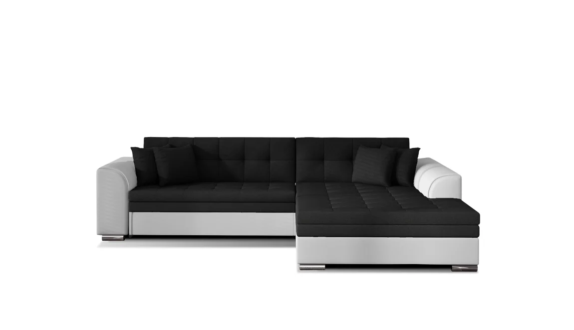 Rohová sedačka ve tvaru L představuje praktické řešení pro moderní obývací pokoj. Je dodávána v pravém provedení a kombinuje černou látku Sawana 14 s bílou ekokůží Soft 17. Základ tvoří vlnité pružiny a chromové nohy, které zpevňují konstrukci a dodávají jí styl.