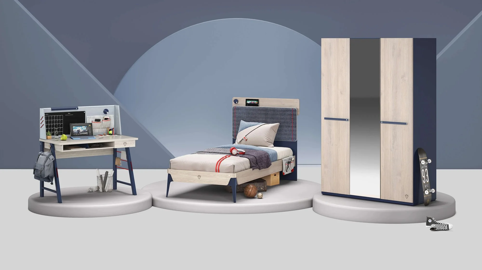 Studentská sestava Trio je ideální volbou pro vybavení vašeho studentského pokoje s důrazem na moderní design a praktické řešení. Tato kompletní sada zahrnuje třídveřovou skříň s integrovaným zrcadlem a šatní tyčí, která nabízí dostatek úložného prostoru a pohodlné uspořádání oblečení. Psací stůl je vybaven menším šuplíkem, otevřenou policí pod deskou a praktickými háčky na školní tašku, zatímco zapuštěný tužkovník a LED osvětlení s třemi nastaveními zvýrazní jeho funkčnost. Postel s rozměrem 100x200 cm je vybavena čalouněným čelem s odkládacím prostorem, dvěma USB porty a textilním kapsářem pro snadný přístup k drobnostem. Tento nábytek je navržen tak, aby vytvářel harmonické a funkční prostředí pro studium i odpočinek. Díky kvalitní konstrukci a moderním prvkům je sestava nejen praktická, ale i esteticky atraktivní, což ji činí ideální volbou pro každého studenta.