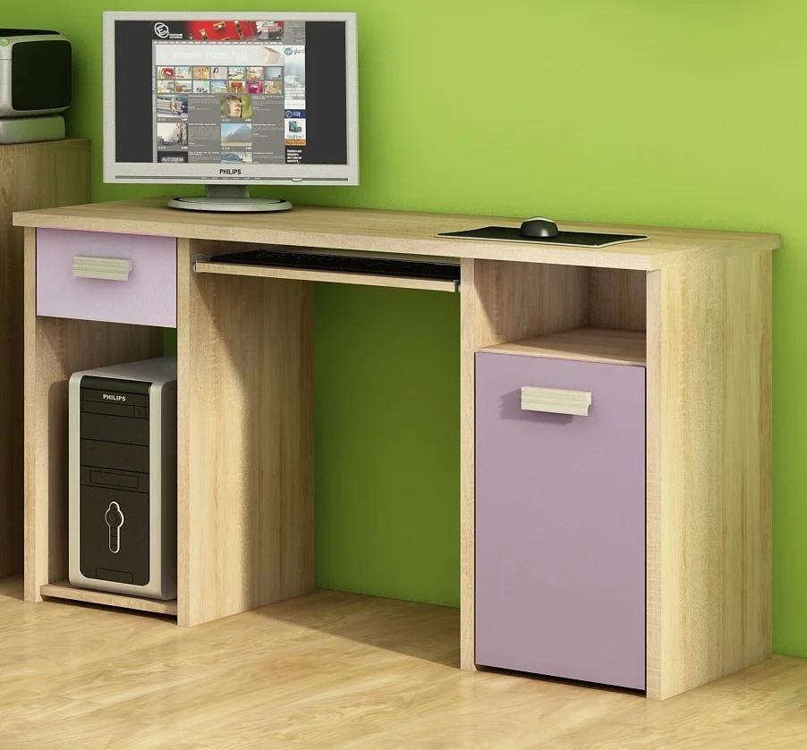 Studentský PC stůl NELLORE 1 se hodí do každého studijního koutku, díky kombinaci barev dub sonoma, levandulová a fialová působí moderním dojmem. Korpus z lamina tloušťky 25 mm a dvířka z lamina 16 mm s ABS hranou 0,6 mm zaručují odolnost a dlouhou životnost.