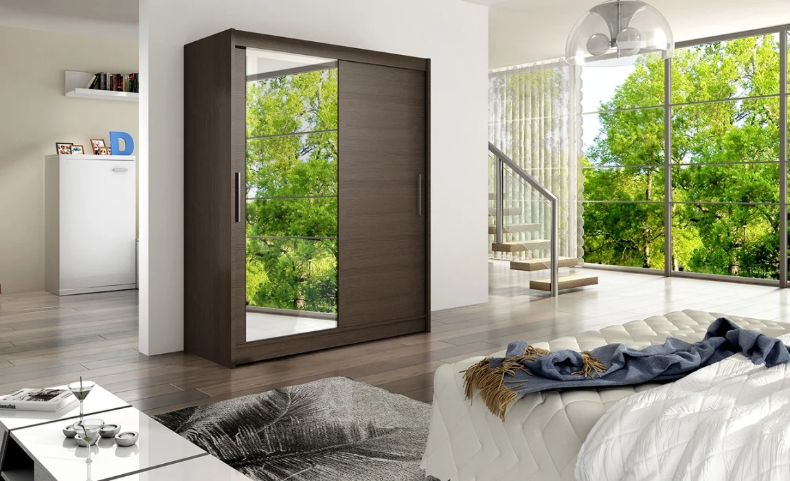 Šatní skříň TABARI VI s vestavěným zrcadlem v provedení choco kombinuje styl s praktickou funkcí. Rozměry 150 × 58 × 200 cm poskytují dostatek prostoru pro oblečení i doplňky. Její konstrukci tvoří laminovaná deska 16 mm s ABS hranami, které zaručují odolnost a snadnou údržbu.