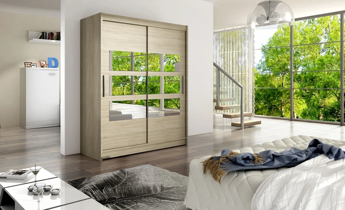 Stylová šatní skříň TABARI VII v dekoru dub sonoma se zrcadlovými pruhy dodá moderní nádech každé šatně. Rozměry 150 cm šířky, 58 cm hloubky a 200 cm výšky nabízejí dostatek prostoru pro organizaci oděvů.