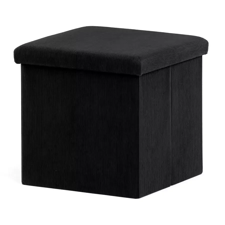Úložný prostor uvnitř poskytuje pohodlné schování drobných věcí, bez potřeby jejich viditelného uspořádání. Díky skládacímu provedení lze taburet snadno složit a ušetřit místo, když ho nepotřebujete. Vysoká nosnost zajišťuje spolehlivé sezení i při každodenním používání. Černá barva je univerzální a hodí se do různých interiérových stylů, zatímco materiál je odolný a snadný na údržbu.