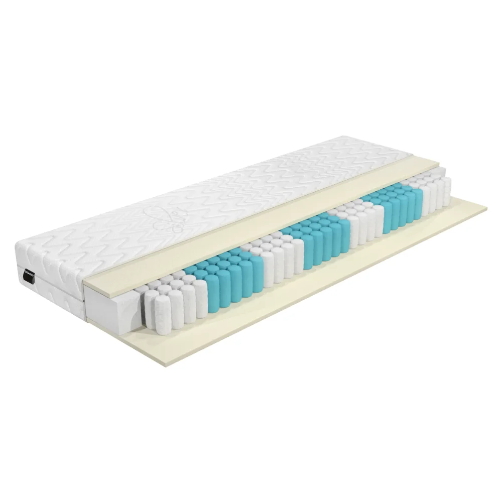 Jádro matrace tvoří taštičkové pružiny doplněné o vrstvu komfortní pěny, která zajišťuje stabilní oporu a pohodlné spaní. Rozměry jsou 90×200 cm, výška 20 cm a nosnost až 120 kg na osobu.