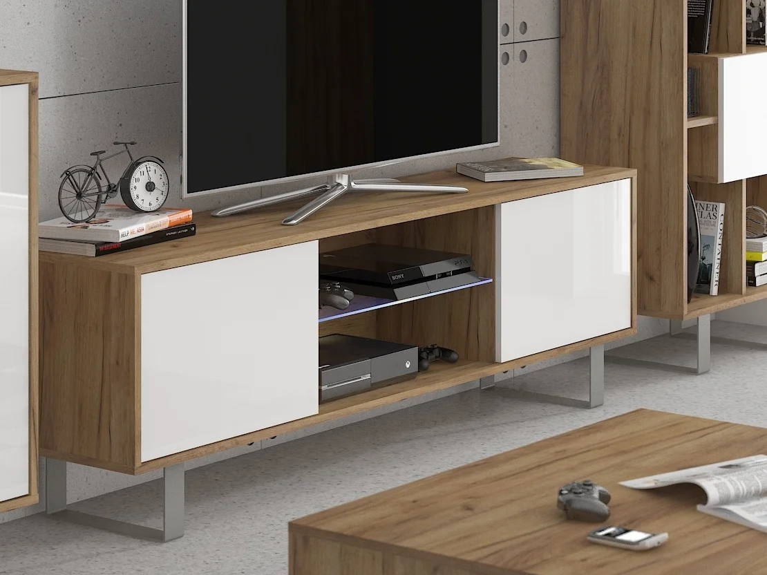 Televizní stolek BOKARO 2 v kombinaci craft zlatý/bílý lesk přináší do obýváku čistý a nadčasový vzhled. Rozměry 160 x 53 x 36 cm poskytují dostatek prostoru pro televizi i praktické doplňky.