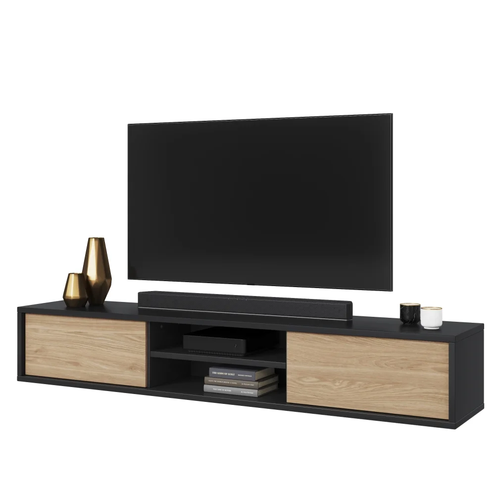 Bezúchytový televizní stolek s výklopnými dvířky a policí lze použít buď jako závěsný prvek na stěnu, nebo jako stolek na nožkách. Vyznačuje se moderní kombinací antracitové barvy a olejovaného dubu, která dodá obývacímu prostoru teplý i nadčasový vzhled. Deska a boční panely jsou vyrobeny z lamina, což zajišťuje snadnou údržbu a dlouhou životnost. Rozměry 180 × 32 × 36 cm a nosnost až 40 kg umožňují bezpečné umístění televize i dalších zařízení. Dodáváno v demontu.