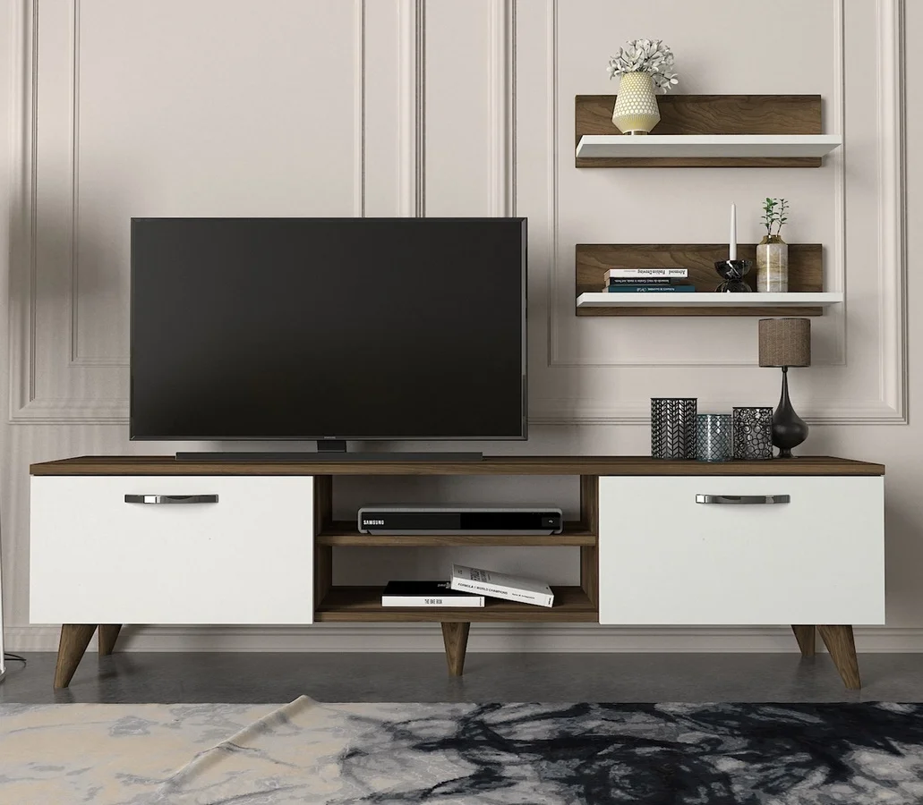 Televizní stolek GALAGO v barevném provedení vlašský ořech a bílá nabízí praktické úložné plochy a moderní vzhled do každé obývací místnosti. Deska a dvířka jsou vyrobeny z kvalitního LTD (lamino) o tloušťce 18 mm a hraněné PVC páskou, což zaručuje odolnost proti poškrábání. Stolek má dvě výklopné dvířka, která skryjí media a kabely, a součástí jsou také dvě závěsné police pro volné uspořádání zařízení. Rozměry: samotný stolek 150 x 40,6 x 29,5 cm a police 50 x 15 x 12,5 cm. Dodáváno v demontu, ale s jednoduchou montáží a stabilní konstrukcí pro dlouhou životnost.