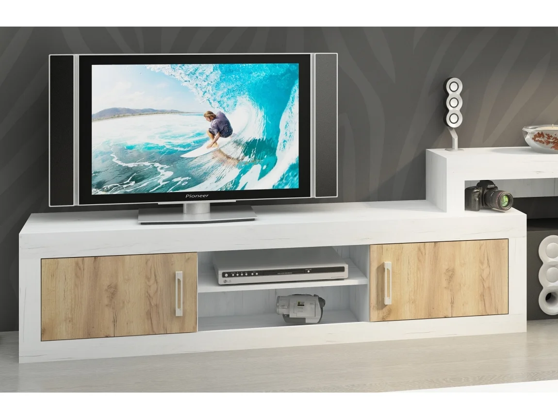 Televizní stolek GOUDINI v kombinaci craft bílé a craft zlaté působí elegantně a nabízí praktický úložný prostor se dvěma dvířky. Jeho konstrukce je z laminované desky tloušťky 16 mm, což zaručuje pevnost a dlouhou životnost.
