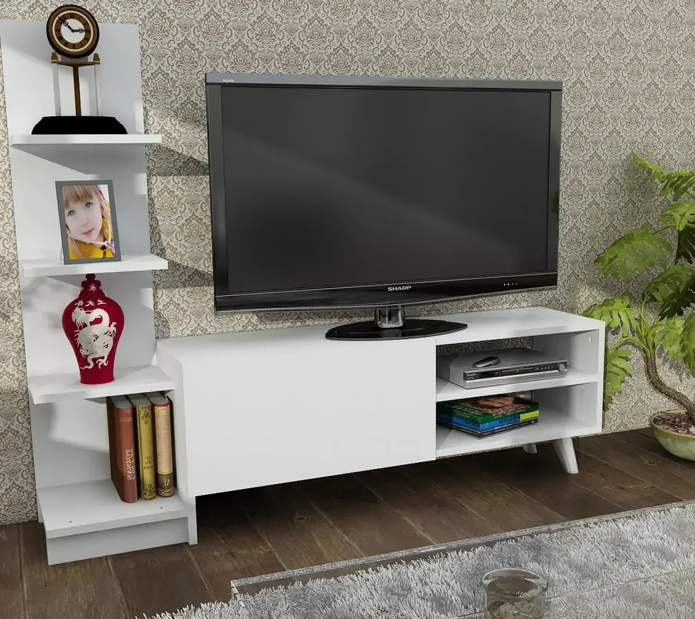 Televizní stolek HINIS s výklopnými dvířky a integrovaným regálem nabízí praktické uspořádání pro televizi a multimedia v čistém designu. Je vyroben z odolného lamina o tloušťce 18 mm a zakončen PVC páskou, díky čemuž má povrch beze škrábanců v elegantní matné bílé barvě. Dodáváme jej v demontovaném stavu, což usnadňuje dopravu a rychlou montáž doma. Díky pevným spojům a promyšlenému provedení je vhodný do obývacích pokojů i pracoven a bude vám sloužit dlouhá léta.