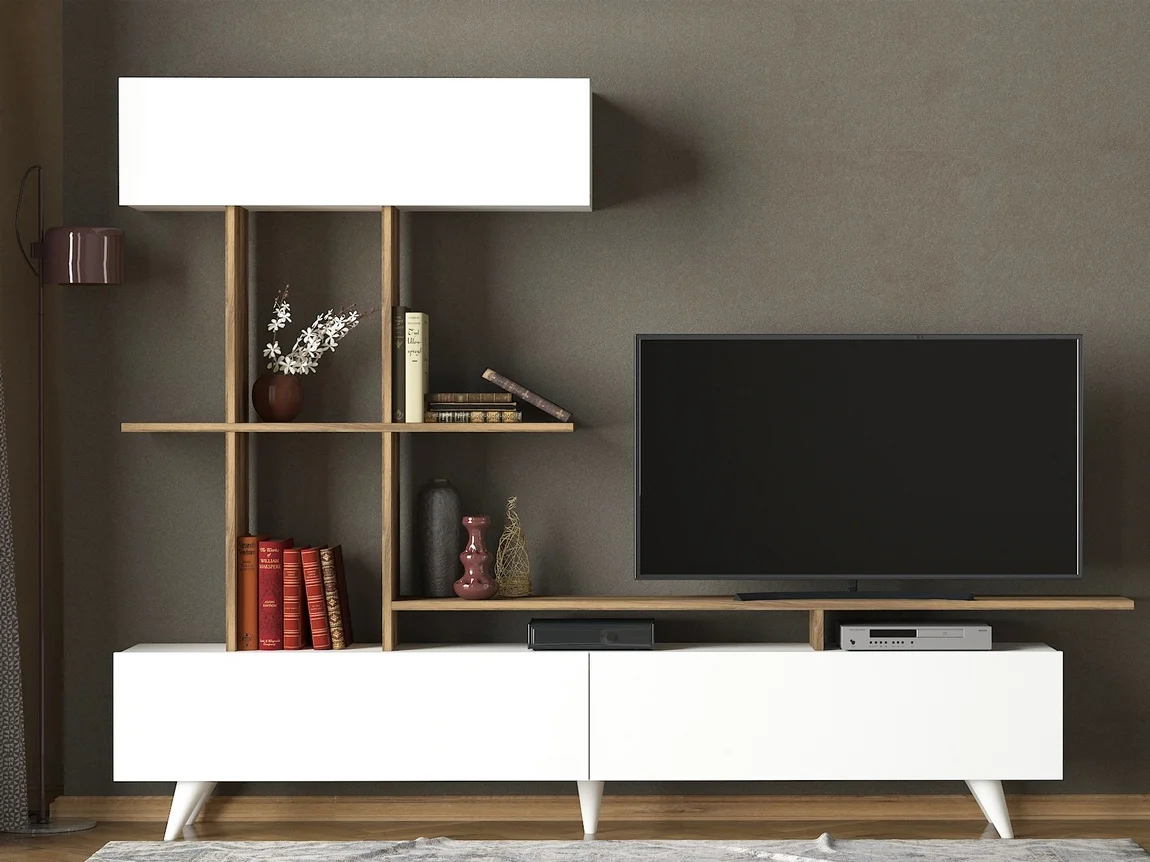 Televizní stolek HORST v sobě snoubí praktický úložný systém s dvěma výklopnými dvířky, regál s policemi a závěsnou skříňkou. Je vyroben z kvalitního lamina tl. 18 mm s PVC hranami, které zajišťují odolnost proti poškrábání a dlouhou životnost. Barevné provedení kombinuje matnou bílou a ořech vlašský, díky čemu působí moderně, ale zároveň teple. Rozměry: televizní stolek 195 × 25,5 × 25 cm, regál s policemi 89,6 × 25,5 × 25 cm; výška celé sestavy je 180 cm. Materiál: LTD (lamino). Dodání v demontu. Pro lepší organizaci prostoru a kabelů doporučujeme využít regál s policemi spolu s televizním stolkem, čímž dosáhnete čistého a praktického vzhledu.
