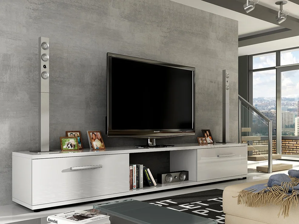 Stolek LOBA RTV má korpus v bílé barvě a dvířka s vysokým leskem, což vytváří elegantní vzhled do každého obývacího pokoje. Jeho šířka 176 cm, hloubka 40 cm a výška 28 cm poskytují dostatek prostoru pro televizi i doplňky.