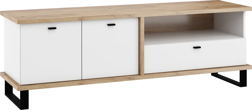 Televizní stolek ORSOLA 2D1S kombinuje dub craft zlatý/bílá pro moderní a svěží vzhled obývacího prostoru. Ve skříňkách najdete dvě dvířka, jednu zásuvku a otevřenou polici pro praktické uspořádání médií.