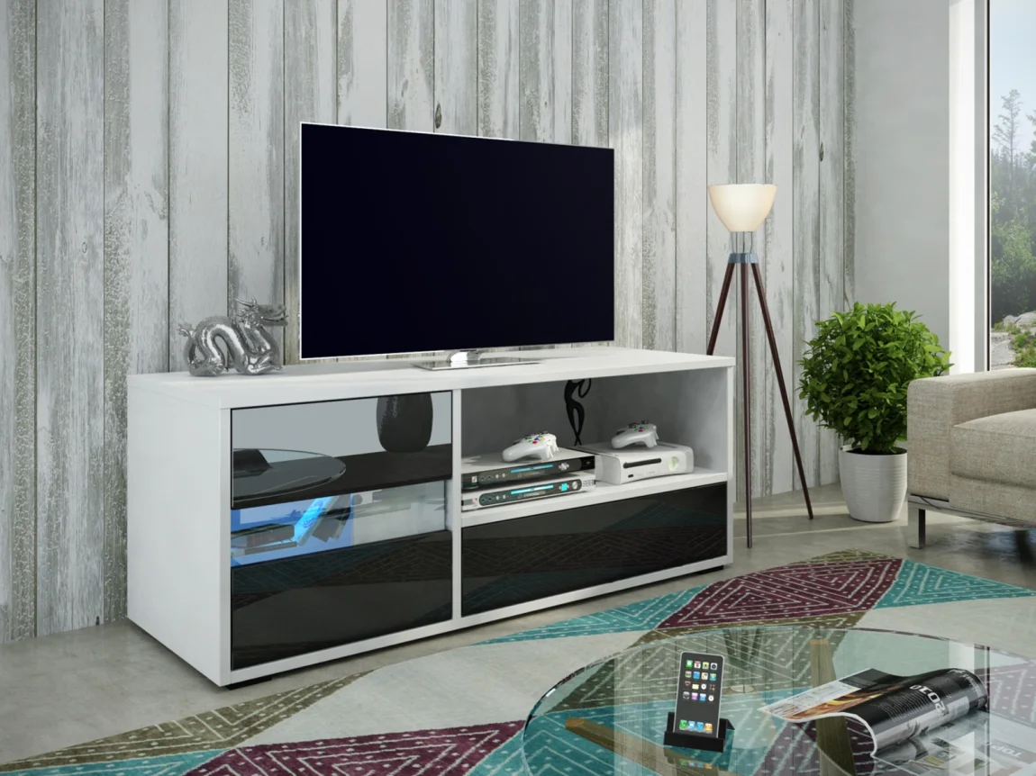 Televizní stolek PaxTakor A představuje moderní design v kombinaci bílé a černého lesku, který se hodí do každého obývacího pokoje. Rozměry 100 × 45 × 39 cm poskytují dostatek prostoru pro televizi, media zařízení i doplňky.