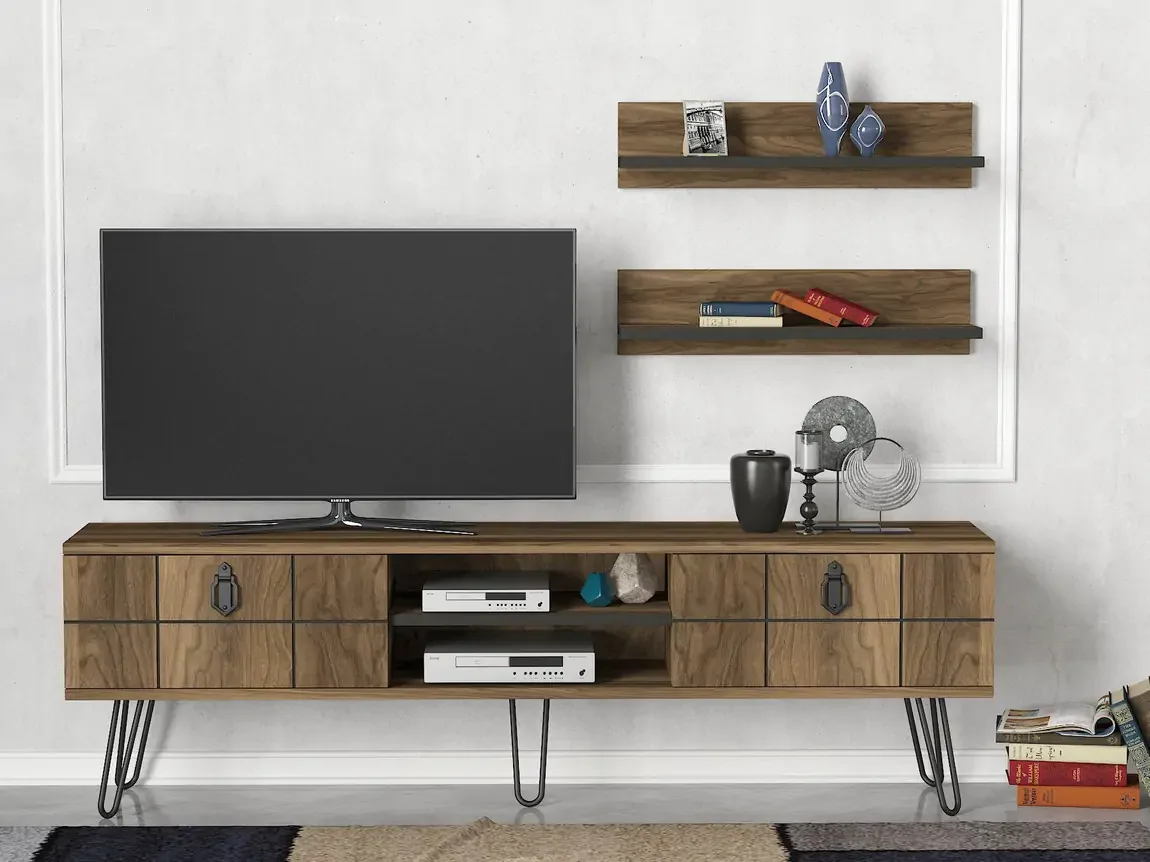 Stolek stojí na kovových nohách a má výklopná dvířka, která ukrývají mediální techniku a kabely. Součástí setu jsou dvě závěsné police o rozměrech 60 × 14,5 × 14,5 cm, poskytující dodatečné úložné prostory. Díky nadčasovému designu se hodí do jakéhokoli obývacího prostoru a výborně se kombinuje s dalšími prvky řady RETIRO. Dodáváme v demontovaném stavu. Vytvořte si s ním praktický a stylový koutek pro váš televizní systém.