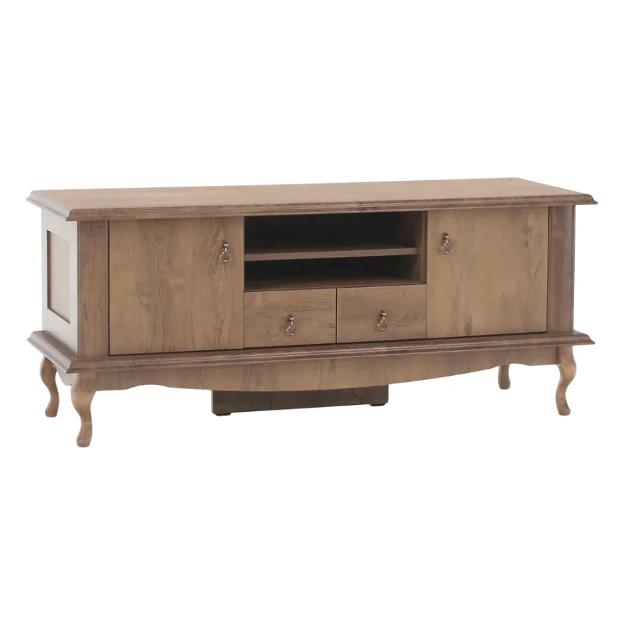 Televizní stolek VILAR DA14 v barokním stylu s provedením dub Lefkas zaujme nadčasovým vzhledem a praktickým úložným prostorem. Nabízí otevřenou polici, dva šuplíky a dvě jednodveřové skříňky pro uschování ovladačů, dokumentů a dalších drobností. Kovové úchytky dotvářejí stylový detail a ladí s dezénem dřeva. Deska a korpus jsou vyrobeny z laminované dřevotřísky s ABS hranami, což zaručuje odolnost a snadnou údržbu. O stabilitu stolku se postarají dřevěné nohy a výška spodního prostoru 15 cm od podlahy usnadňuje úklid pod nábytkem. Tloušťka materiálu činí 30 mm, což zajišťuje pevnost a dlouhou životnost. Dodává se v demontu, s návodem k rychlému sestavení. Díky neutrálnímu dekoru a nadčasovému vzhledu se snadno hodí do různých interiérových stylů a prostoru pro multimediální zařízení.