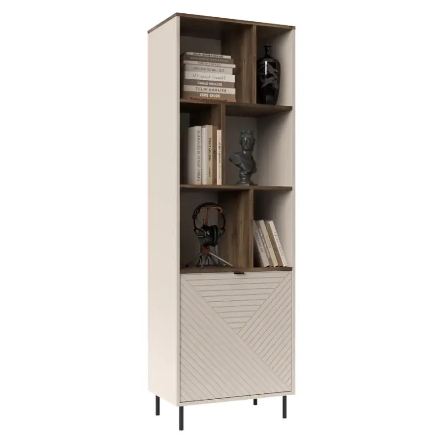 Otevřený regál EYCO 1D kombinuje uzavřenou skříňku se samostatným otevřeným prostorem, který je rozdělen policemi pro praktické uložení věcí. Dvířka lze snadno montovat na pravou i levou stranu, takže nábytek přizpůsobíte dispozicím místnosti. Materiál tvoří laminovaná DTD s MDF výplněmi a ABS hranami a barevné provedení kašmír/dub castello působí jemně a moderně. Rozměry jsou 63,4 x 40 x 194,6 cm, tloušťka materiálu 1,6 cm a skříňka měří 59,6 x 59,6 cm; police unesou až 5 kg. Dodáváme v demontu a doplňují ho černé kovové nohy se stejnými černými úchyty, které dodávají nábytku kontrast a eleganci. Systém EYCO vyniká variabilitou a umožňuje sestavit praktickou i stylovou skříňku podle vašeho prostoru. Pro inspiraci a více variant obývacího systému EYCO nahlédněte do naší nabídky.