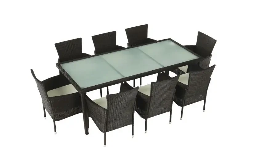 Zahradní set MENIBOR spojuje estetiku umělého ratanu v hnědé barvě s odolnou ocelovou konstrukcí, která zaručuje stabilitu i dlouhou životnost. V sadě najdete 1 stůl a 9 pohodlných křesel s béžovými polštáři pro maximální komfort. Deska stolu je z tvrzeného skla o tloušťce 5 mm a dodává celku elegantní vzhled. Rozměry: křeslo 59 × 62 × 84 cm (tloušťka polštáře 5 cm); stůl 200 × 90 × 74 cm. Dodáváno v demontu pro jednoduchou instalaci na zahradě.