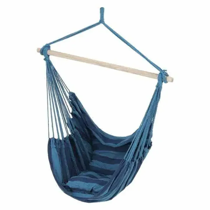 Závěsné houpací křeslo NIKOLO v modré barvě představuje ideální způsob, jak si dopřát relaxaci na čerstvém vzduchu, ať už na terase, balkónu či v zahradě.