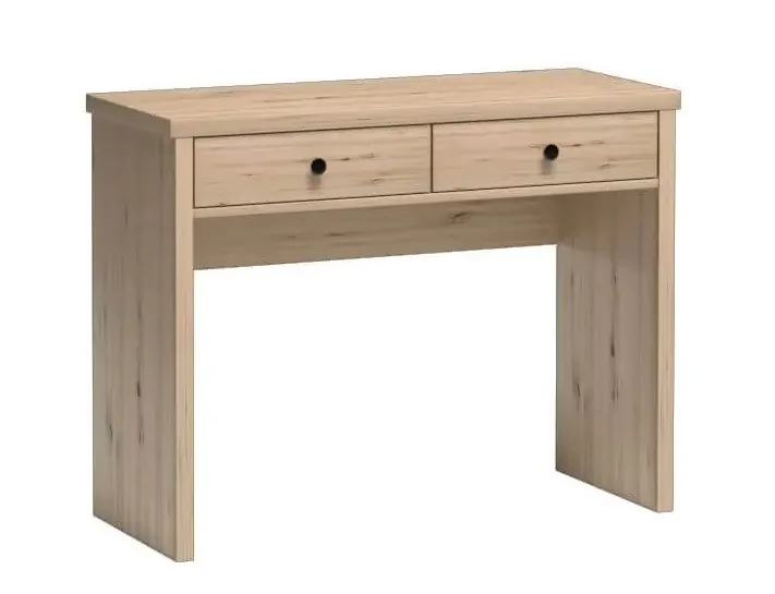 Toaletní stolek BARBUS s dvěma zásuvkami v provedení dub artisan zaujme svou praktickou organizací a nadčasovým vzhledem. Konstrukce je z kvalitního lamina s ABS hranami a dekorativní lamely tvoří MDF deska, díky čemuž je nábytek pevný a odolný vůči běžnému opotřebení. Zásuvky disponují kovovými pojezdy se systémem tichého dovírání, což zajišťuje tichý a plynulý chod. Pro dokonalý vzhled doporučujeme dokoupit panel se zrcadlem a vytvořit tak kompletní kosmetický koutek. Dodáváme ve stavu pro montáž, postup při sestavování bývá jednoduchý a rychlý.