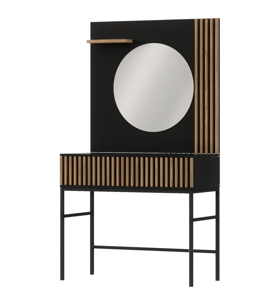 Toaletní stolek CHRISTOBEL patří do naší sektorové řady a spojuje moderní vzhled s praktickými rozměry. Povrch tvoří odolné lamino s ABS hranami a kovovými detaily, v kombinaci černé matné úpravy a dubového provedení artisan.