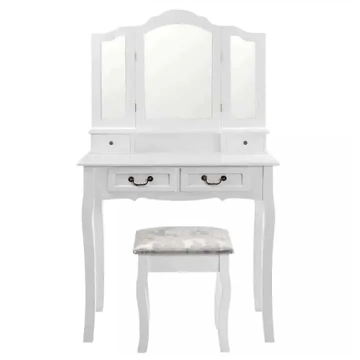 Toaletní stolek REGINA NEW s taburetem nabízí stylový koutek v barokním stylu pro váš každodenní kosmetický rituál. Je vyrobený z MDF a masivu, potažený stříbrnou látkou ze 100% polyesteru a doplněný kovovými úchyty, které dodávají pevnost a lesk. Bílá barva dodává celé soupravě romantický nádech a elegantně rozjasní prostor. Součástí je zrcadlo a čtyři praktické šuplíky pro uskladnění kosmetiky. Ke stolku patří i taburet, který svým designem dokonale ladí s celým kusem. Rozměry taburetu: 38 × 28 × 45 cm. Výška stolku po desku činí 77 cm a nosnost taburetu dosahuje 90 kg. Dodáváno v demontu, montáž je rychlá a jednoduchá.