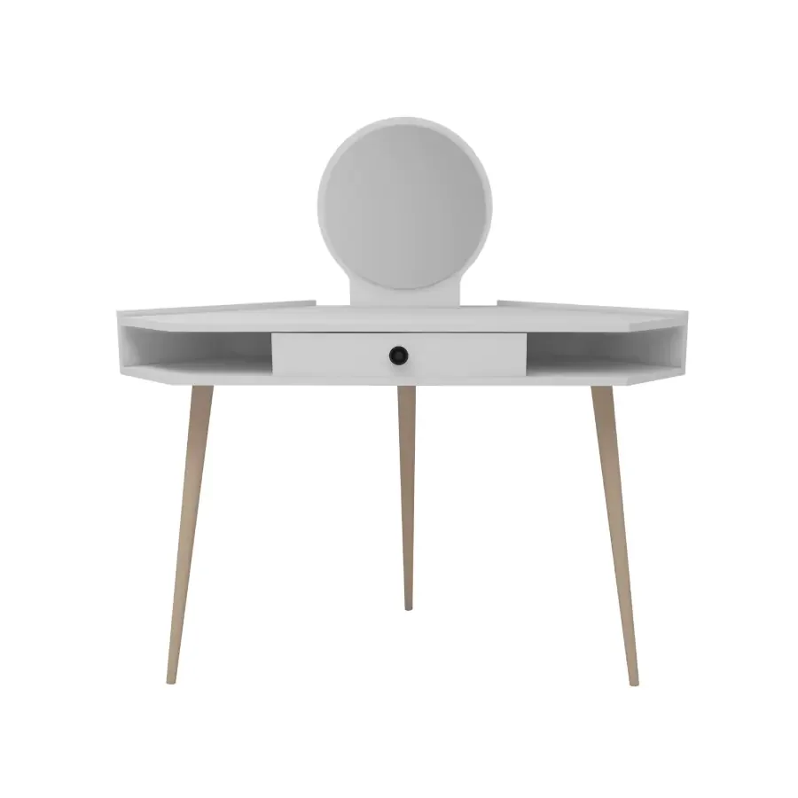 Toaletní stolek VERIA nabízí rohový tvar, který skvěle využije prostor ložnice a dodá interiéru moderní nádech. Rohový design zaručuje efektivní uspořádání a praktické prvky jako zásuvka, regál a integrované zrcadlo pro každodenní péči. Vyrobeno z kvalitních materiálů melamin, VT laminát a masiv, s tloušťkou 18 mm pro pevnost a dlouhou životnost. Rozměry 85.2 x 130.8 x 55 cm, barva Borovice bílá, a dodání v demontu s dřevěnými nohami usnadní montáž doma. Tento stolek kombinuje moderní vzhled s praktičností, díky čemuž se stane stylovým i funkčním doplňkem vaší ložnice a poskytne dostatek místa pro kosmetiku a nezbytnosti.