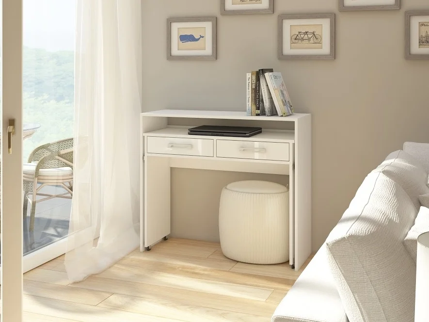 Psací stůl TRIODIA v provedení bílé barvy s bílým leskem působí elegantně a zároveň se snadno čistí. Rozměry: šířka 98 cm, hloubka 39 cm nebo 73 cm a výška 87 cm, takže si vyberete variantu pro váš prostor.