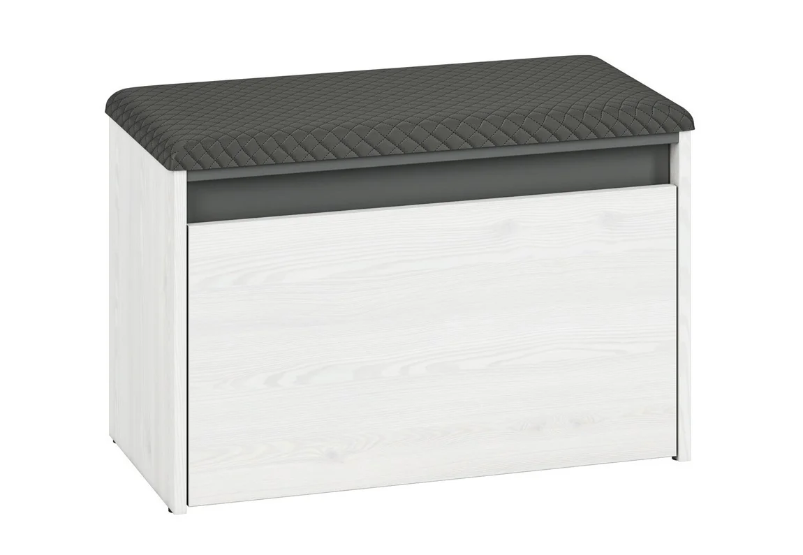 Botník TURBIO II nabízí pohodlné sezení na polstrovaném sedáku a praktický úložný prostor díky výklopným dvířkům. Rozměry jsou 70 × 47 × 34 cm, barva borovice sněžná / antracit a povrchový materiál LTD (lamino) zajišťuje dlouhou životnost a snadnou údržbu.