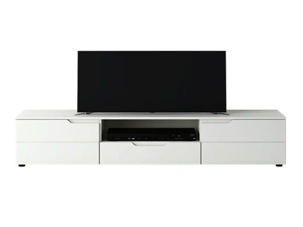 TV stolek APPALACH v provedení bílá s vysokým leskem nabízí dvě skříňky a jednu praktickou zásuvku pro uspořádání médií a příslušenství. Rozměry šířka 160 cm, hloubka 40 cm, výška 43,7 cm zajišťují dostatek prostoru, aniž by stolek působil těžkopádně.