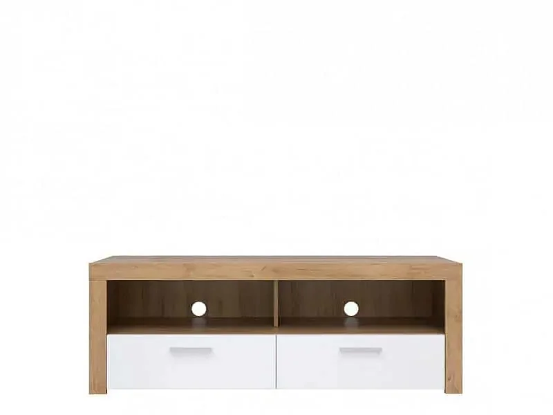 TV stolek Balder RTV2 v kombinaci dub Riviera a bílý lesk působí svěže a moderně. Disponuje dvěma šuplíky a dvěma volnými policemi pro uložení elektroniky a příslušenství, vzadu jsou praktické průchodky pro kabeláž, které udrží pořádek.