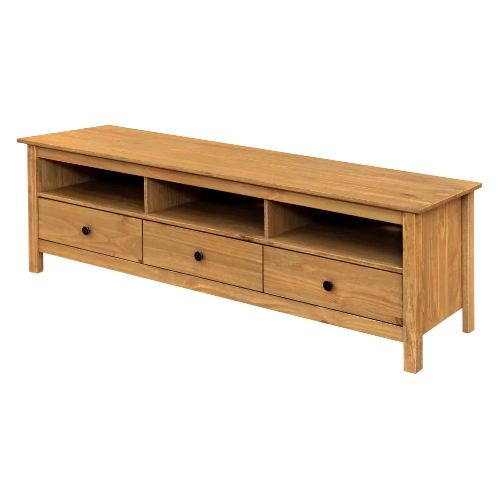 TV stolek z masivní borovice s voskovaným povrchem v teplém medovém odstínu dodává interiéru příjemnou a přírodní atmosféru. Tři praktické zásuvky s kovovými pojezdy poskytují dostatek úložného prostoru pro ovladače, kabely a další doplňky.
