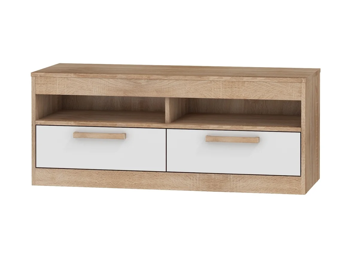 Kompaktní TV stolek Gatton nabízí dvě praktické zásuvky pro uschování ovladačů a drobností. Barva kombinuje dub sonoma s lesklým bílým dekorem a rozměry 110 cm na šířku, 46 cm výšky a 44 cm hloubky vytvářejí stabilní základ pro televizi.