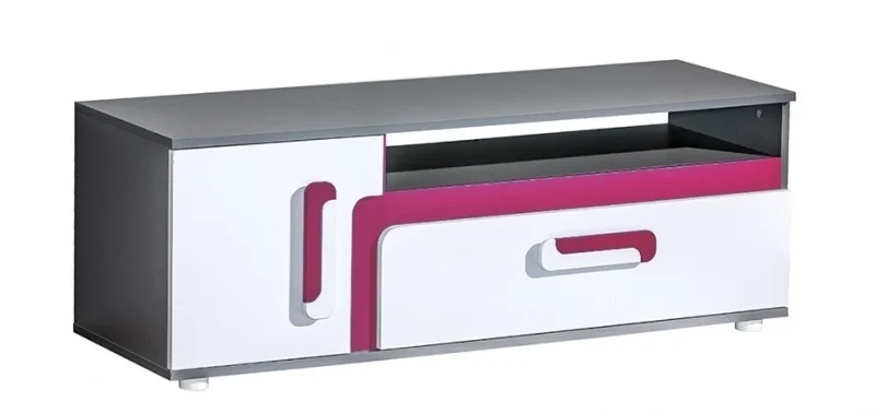TV stolek z sektorového systému s netradičním barevným provedením a originálními úchyty upoutá mladší generaci. Je vyroben z LTD desky s ABS hranou, korpus má odstín šedá antracit a dvířka spolu s čely zásuvek jsou bílé matné, doplňkovou barvou je jemná růžová.