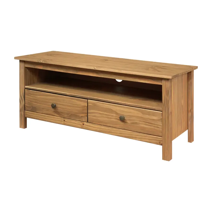 Chcete-li v obývacím pokoji doplnit televizi stylovým TV stolkem, sáhněte po modelu TORINO. Tento kousek je vyroben z masivní borovice v medovém odstínu a dodá prostoru hřejivý, nadčasový vzhled. Jeho vlastní úložný prostor zahrnuje 2 zásuvky s kovovými pojezdy a jednu polici, takže snadno udržíte ovladače, dokumenty i drobnosti vždy po ruce. Kovové úchyty navazují na tmavší doplňky a dodávají celku solidní a moderní vzhled. Horní deska unese až 50 kg, což z něj dělá spolehlivou základnu pro televizi i další dekorace.