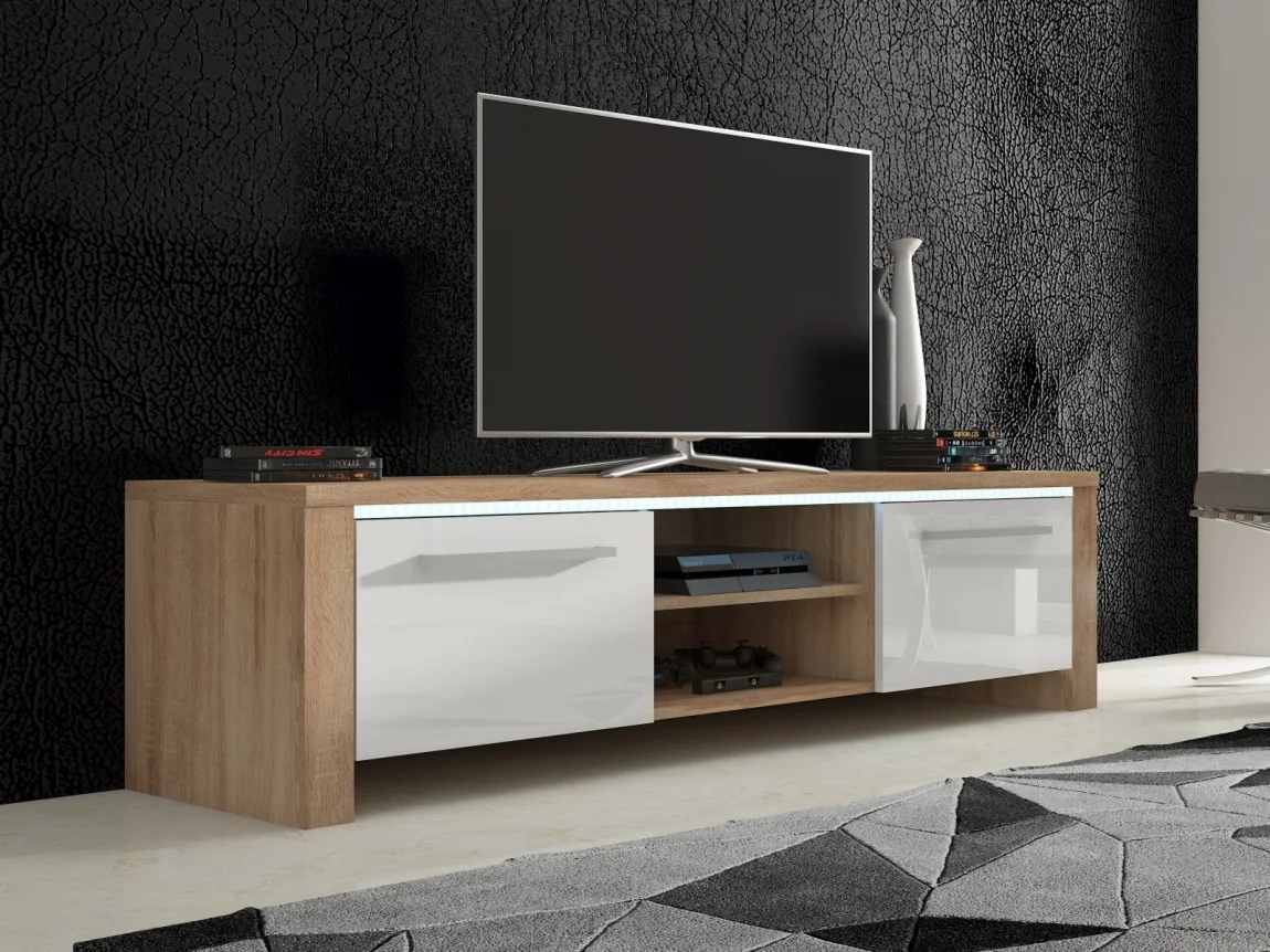 Stylový TV stolek v kombinaci duba Sonoma a lesklé bílé barvy působí moderním dojmem v každém obývacím prostoru. Rozměry: 140 cm šířka, 40,5 cm výška a 42 cm hloubka. LTD desky 16 mm zajišťují pevnost a dlouhou životnost.