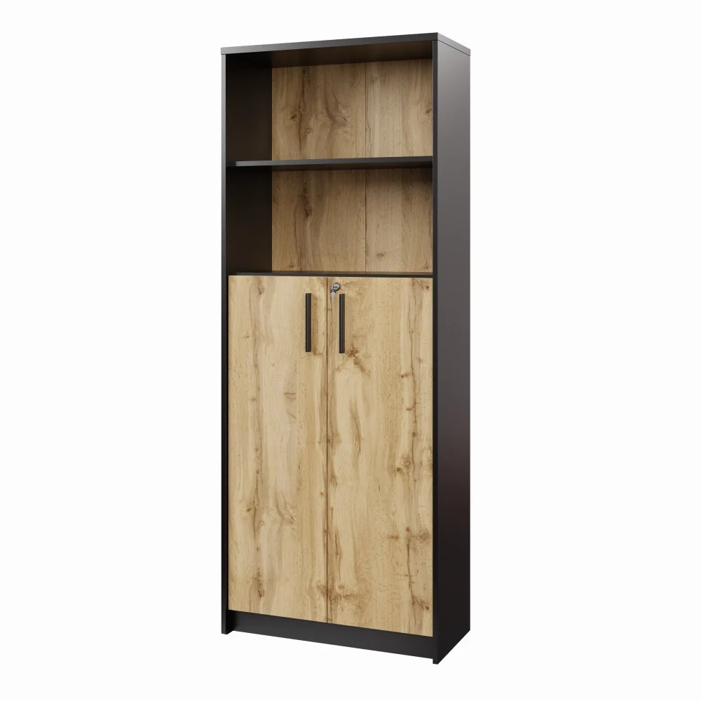 Praktické řešení pro uspořádání kancelářských věcí, které zároveň působí reprezentativně. Skříň je vyrobena z kvalitního lamina v kombinaci černé s dubovým dekorem Wotan a doplněna kovově zbarvenými plastovými úchyty.