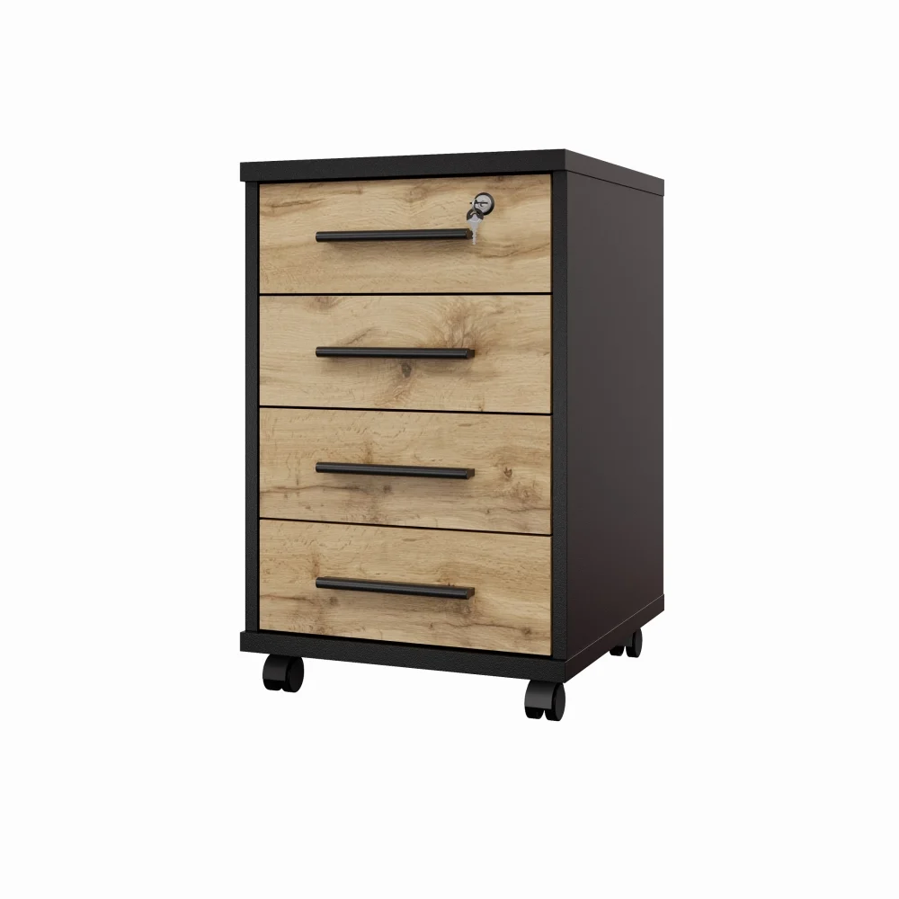 Praktický uzamykatelný kontejner z lamina v kombinaci černé a dekoru dub wotan je ideálním doplňkem každé kanceláře. Je vybaven kovovými pojezdy zásuvek a plastovými úchyty v kovovém provedení, které zajišťují plynulý chod a odolnost.