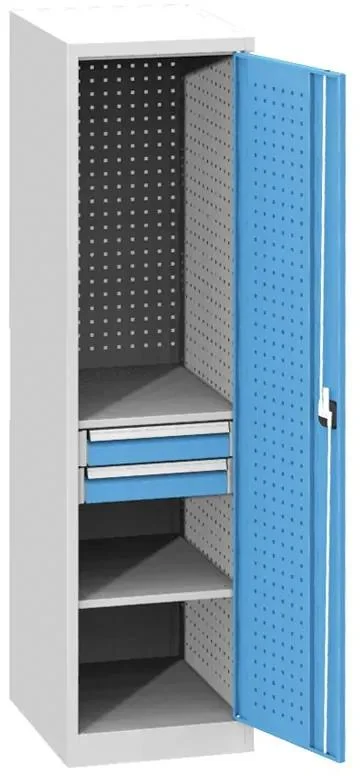 Praktická dílenská skříň od společnosti KOVOS je ideálním řešením pro organizaci vašeho nářadí. Vyrobena je z odolného ocelového plechu o tloušťce 1,0 mm, což zaručuje její pevnost a dlouhou životnost. Tento model nabízí dvě zásuvky a dvě otevřené police, které lze snadno doplnit o další přihrádky nebo zásuvky podle vašich potřeb. Horní část, boční stěny i vnitřní strany dveří jsou vybaveny perforovanými panely, jež umožňují připevnění držáků na nářadí a zvyšují přehlednost. Bezpečnost zajišťuje cylindrický zámek GSB s dvoubodovým rozvorovým mechanismem, který chrání vaše vybavení před neoprávněným přístupem. Korpus skříně unese až 800 kg, což umožňuje skladovat i těžší nástroje. Povrchová úprava práškovou barvou ve světlé šedé RAL 7035 a modrých RAL 5012 dveří je odolná vůči poškození a dlouhodobě zachovává estetický vzhled. Tento skvělý pomocník do dílny nejenže vám usnadní organizaci, ale díky své odolnosti a bezpečnosti je také spolehlivým společníkem při každodenní práci.