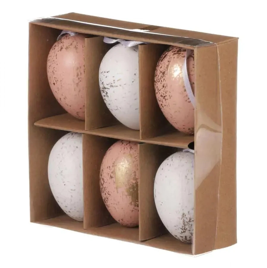 Soubor šesti plastových vajíček určených pro dekoraci velikonoční výzdoby, uložených v elegantní papírové krabičce s jemným zlatým zdobením. Pozor: nejsou určena pro hraní a slouží výhradně jako dekorace. Vajíčka jsou dodávána v jemně růžové barvě, která dodá jarní atmosféru vašim aranžím. Díky pevné plastové konstrukci vydrží opakované použití a snadno se skladují. Ideální volba pro velikonoční výzdobu stolu, věnců či dárkových balení a pro tvořivé DIY projekty.