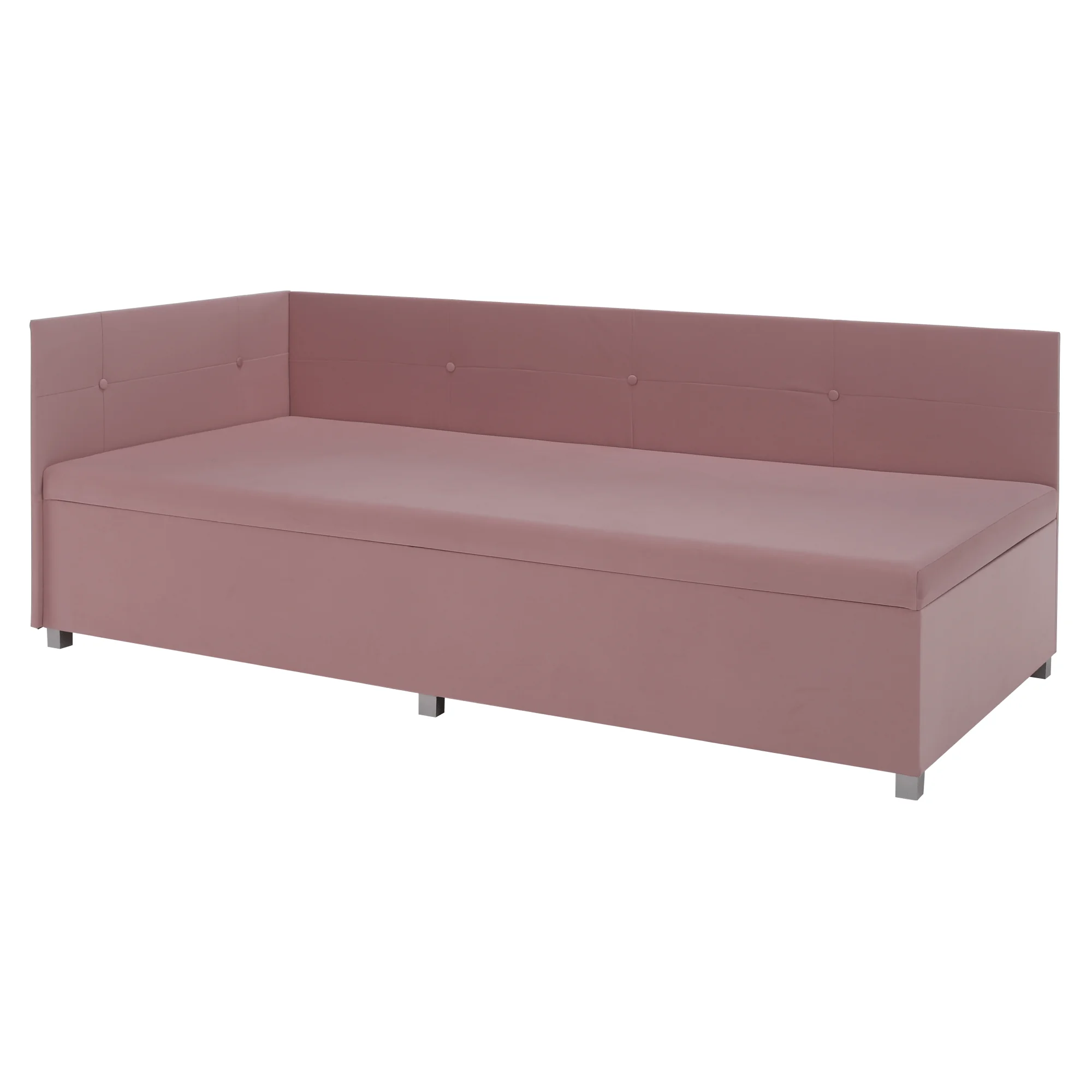 Válenda AURIA UNI v růžové barvě kombinuje odolnou laminovanou konstrukci DTD s pohodlným spaním díky jádru z PUR pěny T28. Úložný prostor se skrývá v bočním výklopu, který usnadní ukládání ložního prádla a sezónních věcí. Čelo je prošívané a vysoké, což dodává eleganci a zároveň chrání stěnu před odřením. Rozměry 93 x 204 x 75 cm zahrnují spací plochu 90 x 200 cm, výšku od podlahy po matraci 42 cm a nosnost 110 kg; tuhost matrace je uvedena jako H3 pro vyváženou podporu. Dodáváno v demontu, ale hotový vzhled doplní dekorativní knoflíky a stylové detaily.