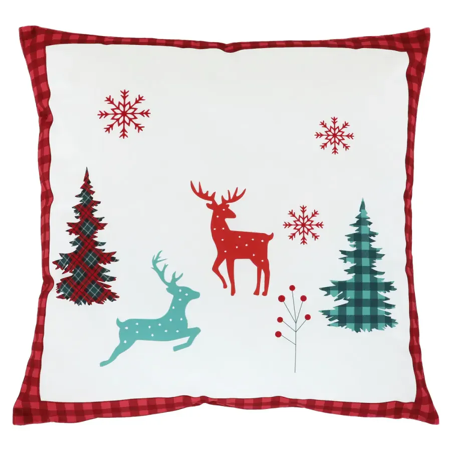 Vytvořte si doma kouzelnou vánoční atmosféru díky tomuto sametovému polštáři UBR093-1. Rozměry 45 × 45 cm a povrch z 100% polyesteru zaručují jemný dotek a pohodlí při sezení. Motiv jelenů, stromečků a vloček v červeno-zelené paletě na bílém podkladu dodává polštáři tradiční sváteční vzhled, zatímco červený lem motiv ještě více zdůrazní.